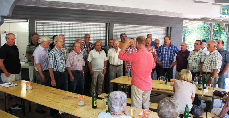 Unter der Leitung unseres Dirigenten Walter Muth brachten wir einige Lieder zu Gehör. Danach gab es in fröhlicher Runde viel zu erzählen und auch der beginnende Regen konnte die gute Stimmung nicht trüben. Unter dem Vordach fanden schließlich alle einen trockenen Platz. So klang unser Singstundenabschluss in den späten Abendstunden aus.