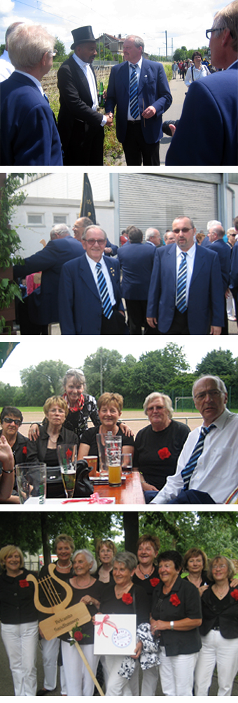 Der MGV „Frohsinn“ 1863 e.V. Mauer feierte am Wochenende vom 28. - 30.06. sein 150. Vereinsjubiläum. Wir beteiligten uns mit beiden Chören am Sonntag, dem 30.06. an den Feierlichkeiten. Der Männerchor machte sich bereits um 10.30 Uhr mit dem Bus vom Festplatz aus auf den Weg nach Mauer. Dort nahmen wir zuerst am Freundschaftssingen im Festzelt teil. Für die unter der Leitung unseres Vizedirigenten Timo Machmeier vorgetragenen Liedern erhielten wir von den Besuchern viel Applaus. Bis zum Festumzug war noch genügend Zeit, sich zu stärken und gegen den Durst anzukämpfen. Gegen Mittag kam der zweite Bus aus Sandhausen mit unserem Frauenchor „Belcanto“ in Mauer an. Gemeinsam machten wir uns auf den Weg zu unserem Startplatz für den Festumzug. Bei Sonnenschein und bester Stimmung setzte sich der Zug pünktlich in Bewegung und von den vielen Zuschauern an der Wegstrecke gab es jede Menge Beifall.