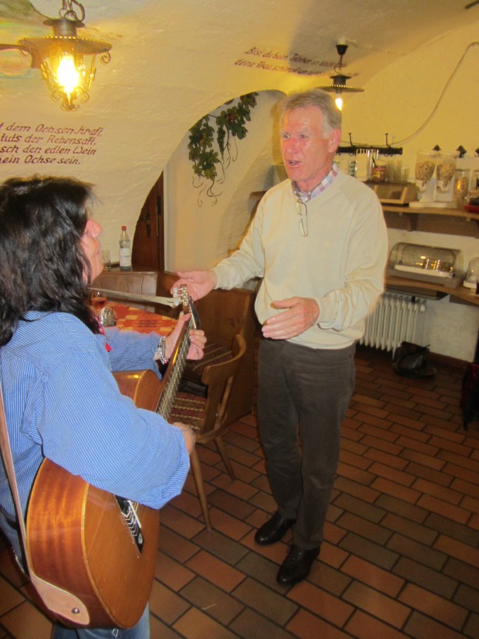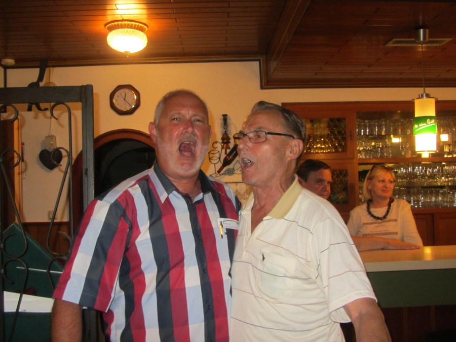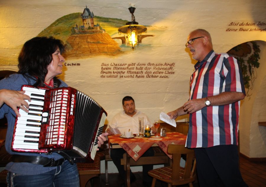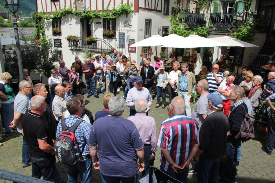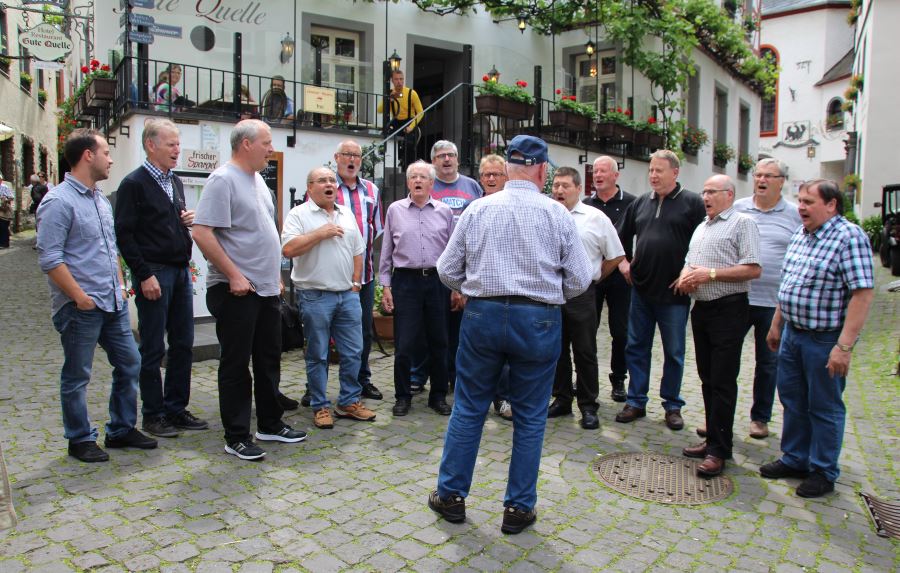 Der nächste Tag begann mit einem reichhaltigen Frühstücksbuffet. Danach wurde der Bus bestiegen und unser erstes Reiseziel war das Städtchen Cochem. Leider war durch die vielen Niederschläge in den vergangenen Tagen die Mosel über die Ufer getreten, sodass die Fahrtroute geändert werden musste. Es führte uns der Weg zum Teil über die Autobahn. In Cochem hatte jeder die Möglichkeit, die Stadt mit ihren Sehenswürdigkeiten auf eigene Faust zu erkunden. Viele zog es zur hoch über der Stadt gelegenen Reichsburg, wo man bei einer Führung vieles über die Geschichte der Anlage erfahren konnte. Oder man genoss den traumhaften Ausblick auf die Stadt und die schöne Landschaft. Von oben sah die Mosel schon ein wenig bedrohlich aus mit ihren braunen Fluten. Aber auch unten in der Stadt mit den alten Fachwerkhäusern, dem schönen Marktplatz und den engen Gassen lohnte sich der Aufenthalt. Nicht nur die Germania machte an diesem Tag im Ort Station, auch eine belgische Frauenmusikgruppe war unterwegs und spielte am Marktplatz auf. Danach ging es mit dem Bus weiter in den Ort Beilstein. Auch hier war es ein Genuss, die engen Gassen mit den alten Häusern zu bestaunen. Auf der Treppe zur Klosterburg machten wir unser Gruppenfoto. Danach war es wieder an der Zeit, einige Lieder zur Freude der vielen Touristen zu präsentieren. In der Zwischenzeit hatten sich alle Sänger an den Vize-Vize-Dirigentenstil gewöhnt und so gab es keine Probleme mit den zugegeben unorthodoxen Einsatzzeichen. Nach einem kräftigen Regenguss - die meisten waren Gott sei Dank eingekehrt – entschlossen wir uns vor der Fahrt zum Tagesabschluss in einem Winzerhof nochmals ins Hotel zurückzufahren. Auf der Anfahrt zum Abschlusslokal des zweiten Reisetages machten wir nochmals einen kurzen Halt, um einen tollen Ausblick auf die Moselschleife zu genießen. Im Lokal wurden wir bereits erwartet. Bei Livemusik durch Hausmusiker Manfred war gute Stimmung angesagt. Nach dem Abendessen stand eine Weinprobe auf dem Programm. Der Winzer erklärte sehr anschaulich die Situation der Arbeiten in den Steillagen und die Besonderheiten der Region. Bei der Verkostung konnte man sich von der guten Qualität der Moselweine überzeugen. Mit Musik und Gesang klang der Abend aus und die Rückfahrt wurde angetreten. Im Hotel angekommen war aber für viele noch nicht ans Schlafengehen zu denken. In der Gaststube ließen wir den Tag ausklingen. Da unsere Stimmbänder mit Moselwein gut geschmiert waren, erklangen nochmals unsere Stimmen. Nach dem Motto „Je später der Abend“ waren sogar Solovorträge dabei. Unserem kanadischen Gast Albert Reutner, der mit seinem Enkel an der Reise teilnahm, ging das Herz auf bei den alten Volksliedern und er sang kräftig mit. So endete der zweite Reisetag.