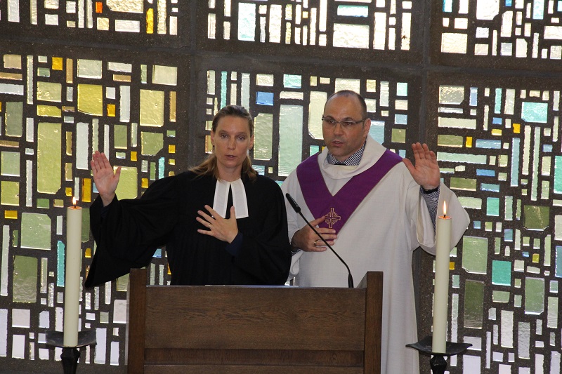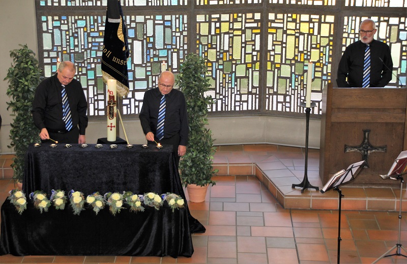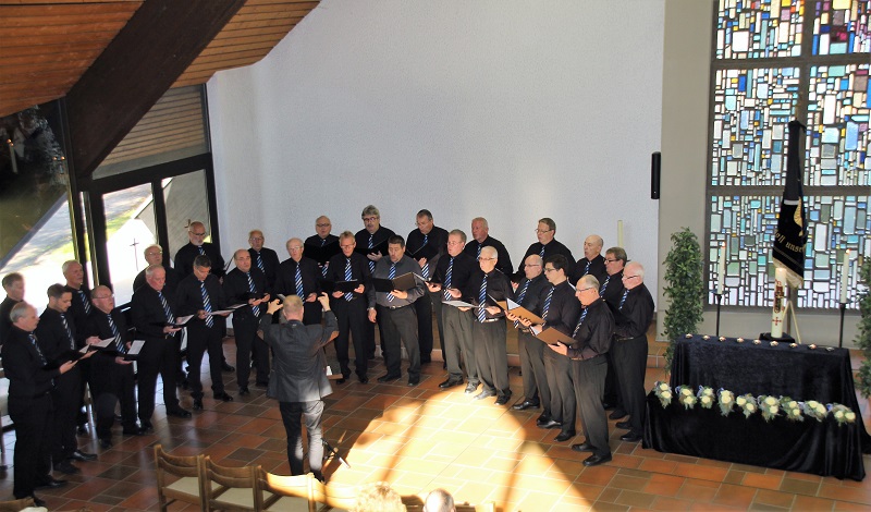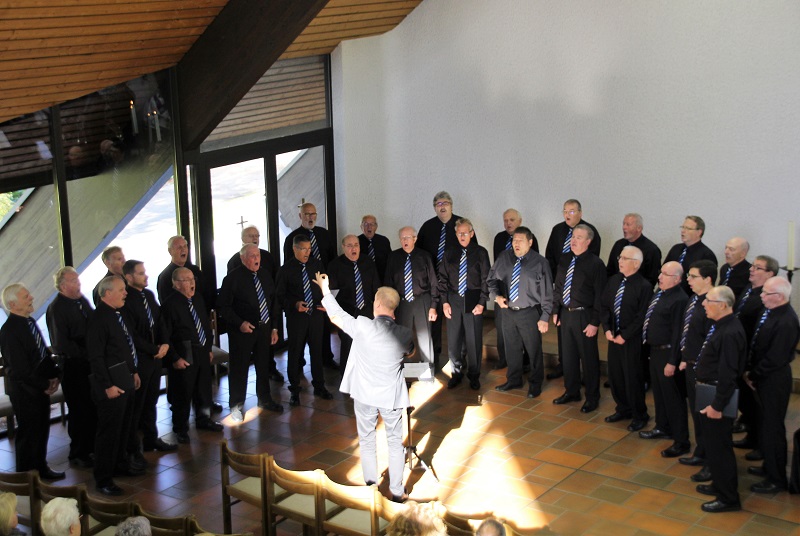 Nach deren Eingangsstück folgte die Begrüßung und die liturgische Eröffnung mit dem Tagesgebet durch die beiden Geistlichen. Danach ließen wir erstmals unter der Leitung unseres Dirigenten Walter Muth unsere Stimmen mit dem Lied „Lord I Want to Be a Christian“ erklingen. Es schlossen sich eine Schriftlesung sowie die Ansprache über diesen Lesungstext an. Danach sangen alle gemeinsam begleitet vom Posaunenchor das Lied „So nimm denn meine Hände“. Es folgte unser Nachruf mit dem Verlesen der Namen unserer verstorbenen Mitglieder. Für jedes wurde bei der Namensnennung eine Kerze entzündet. Danach erklang unser Liedvortrag „O, wie herbe ist das Scheiden“. Die Fürbitten schlossen sich an. Danach erhoben wir nochmals unsere Stimmen mit dem Gesungenen „Vater unser“.