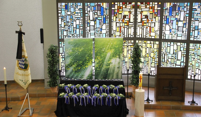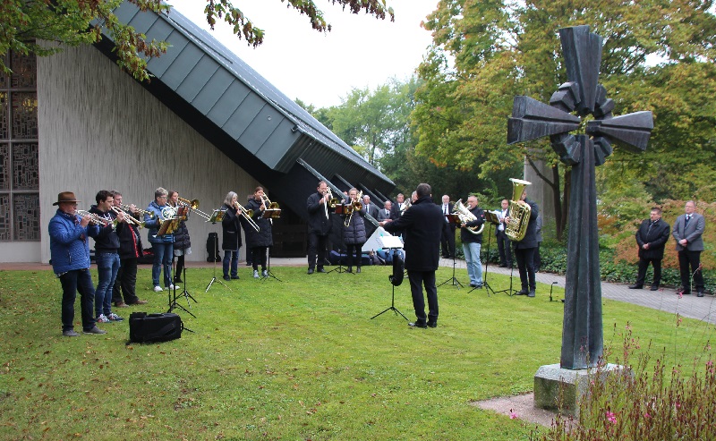 Am Sonntag, den 17. Oktober gedachten wir wieder in einer ökumenischen Gedenkfeier unseren in den letzten 12 Monaten verstorbenen Mitgliedern. Auch in diesem Jahr stand die Feier im Zeichen der Corona-Pandemie. So war es notwendig, die aktuell gültigen Richtlinien und Hygieneschutzregeln einzuhalten und umzusetzen. Bei der von Pfarrer Bernhard Wielandt und Gemeindereferentin Ulrike Keßler gestalteten Feier in der Aussegnungshalle des Waldfriedhofes wirkte auch wieder der Evangelische Posaunenchor unter der Leitung von Michael Häcker mit. Auf Grund der eingangs erwähnten Umstände spielten sie vor der Trauerhalle.