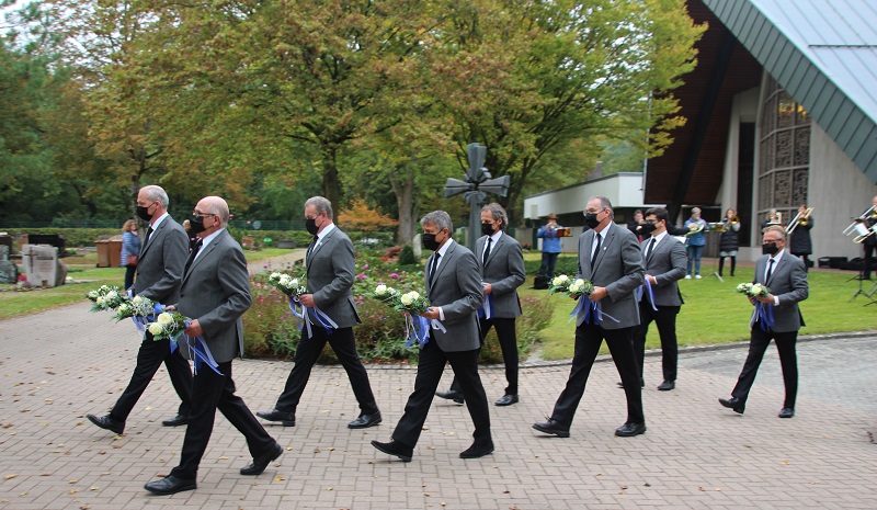 Nun war wieder der Chor zu hören. Mit dem Lied „O wie herbe ist das Scheiden“ leiteten wir zu der Verabschiedung und dem Segen durch die beiden Geistlichen über. Unter den Klängen des Posaunenchors verließen wir die Aussegnungshalle und legten an den letzten Ruhestätten der Verstorbenen Blumen nieder. Dankend lauschten die Teilnehmer sowie die Besucher des Friedhofs den vorgetragenen Weisen des Posaunenchors.
