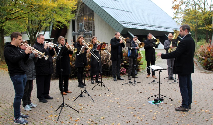 Der „Ev. Posaunenchor“ hatte sich in der Zwischenzeit am Kreuz vor der Trauerhalle aufgestellt und trug noch einige Musikstücke vor. So erschallten auch zur Freude der Friedhofbesucher herrliche Posaunenklänge über den Kirchhof.