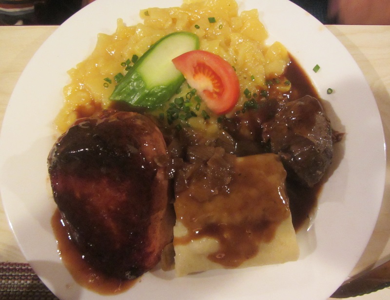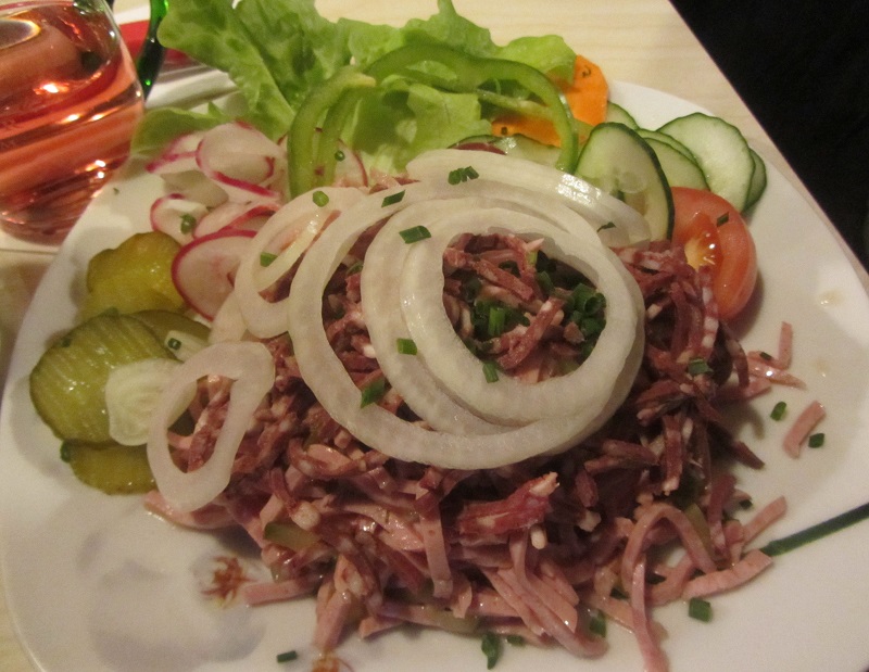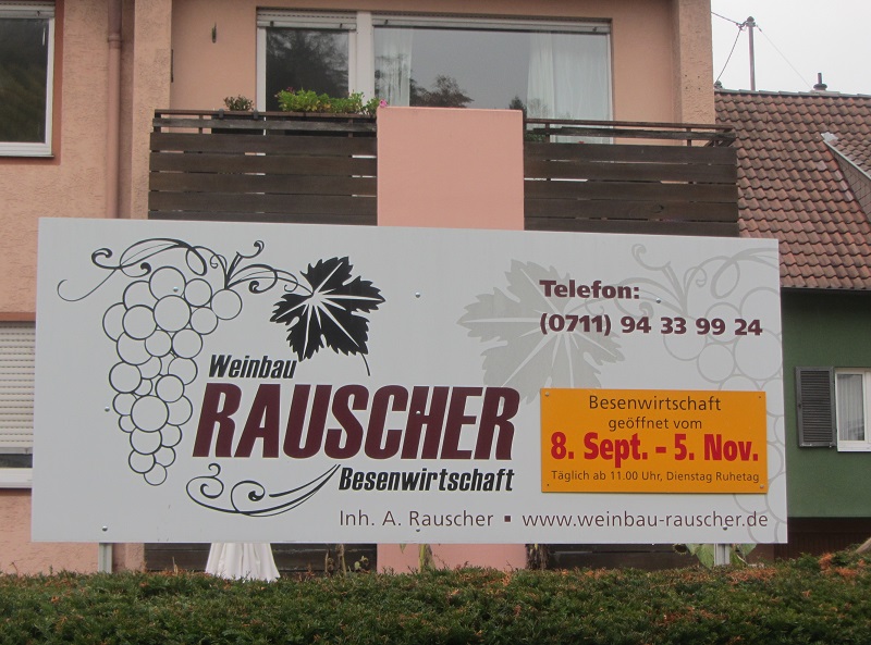 Hier wurden wir nochmals vom Hausherr Andres Rauscher herzlich willkommen geheißen. Nachdem wir unsere reservierten Plätze eingenommen hatten, wurden unsere Getränkewünsche aufgenommen. Die bestellten Flüssigkeiten waren schnell serviert, die Schwaben wissen offensichtlich, wie schlimm Durst sein kann. Da uns mittlerweile auch der Hunger plagte, wurden sehr zügig auch die Bestellungen von der reichhaltigen Besenspeisekarte entgegengenommen. Trotz gut besuchter Lokalität ließ das Essen nicht lange auf sich warten. Alle erhielten ihre bestellten Speisen und konnte so die schwäbische Küche genießen. Dafür war Brigitte Rauscher, Andreas Mutter, zuständig. Der Hausherr war immer mit dem Weinkrug unterwegs, um die leeren Gläser wieder aufzufüllen, geschäftstüchtig schwäbisch eben.