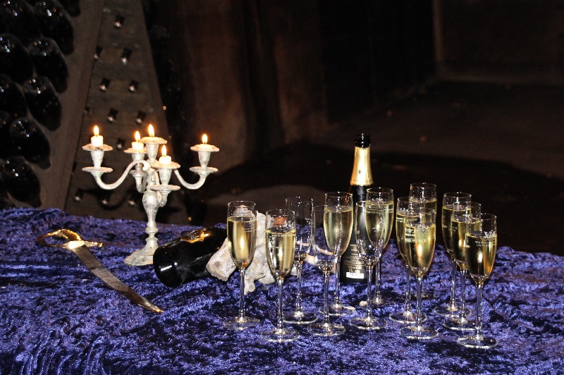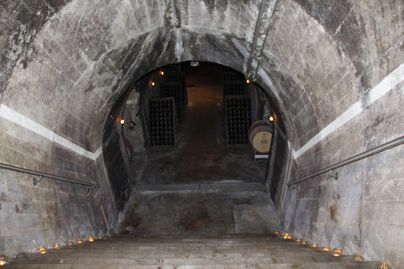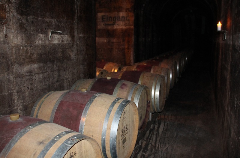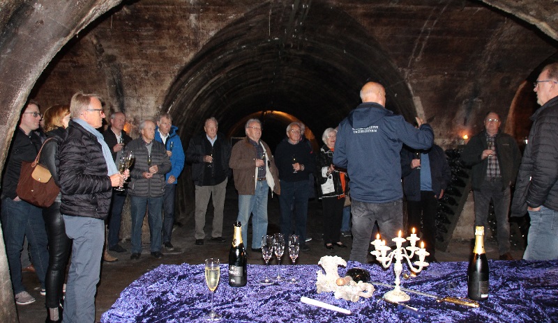 Der erste Weg führte uns hinab in den Sektkeller, welcher früher als Luftschutzkeller diente. Er besteht aus einem Längs- und zwei Querstollen. Am Ende des Längsstollens befindet man sich 50 Meter unter der Erde. Flackerndes Kerzenlicht ließ eine gruselige Stimmung aufkommen. Hier erfuhren wir sehr viel Wissenswertes über die Sektherstellung und die Flaschengärung. Die konstante Temperatur und hohe Luftfeuchtigkeit sorgen für ideale Bedingungen. Aber auch, dass wir heute noch die 1902 durch den Reichstag zur Finanzierung der kaiserlichen Kriegsflotte eingeführte Schaumweinsteuer zahlen müssen. Eine Verkostung des edlen Getränks beschloss den ersten Teil der Führung.