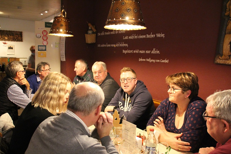 So verlief der Abend in super Atmosphäre und wir konnten die Alltagssorgen einmal hinter uns lassen. Wohl wissend, dass wir uns in „Feindesland“ befanden, überzeugten wir zumindest Walter uns mit der Gitarre beim „Badner Lied“ zu begleiten. Und bei den vielen bekannten Melodien, welche die Beiden in ihrem Repertoire hatten, wurden unsere Stimmbänder stark strapaziert. Zum Glück ging im Besen der „Schmierstoff Trollinger“ nicht aus. So neigte sich langsam aber sicher unser Ausflug dem Ende zu. Den Abschluss machte Markus mit dem Lied „Feierabend“. Nachdem alle ihre Zeche beglichen hatten, hieß es Abschiednehmen.