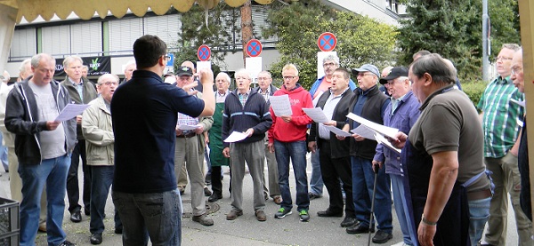 Unsere Helfer hatten dann alle Hände voll zu tun, um die Gäste mit Speis und Trank zu versorgen. Am Nachmittag kamen dann die Sänger des MGV Harmonie aus Eschelbach zum Gegenbesuch. Unter der Leitung ihres Dirigenten Helmut Epp erfreuten sie die Gäste mit passenden Liedern. Als Dankeschön durfte ihr Vorstand „Original Sandhäuser Hausmacher“ in Empfang nehmen. Im kurzfristig umfunktionierten Zopfazelt erschallten danach noch weitere Lieder. So endete der Samstag in den späten Abendstunden.