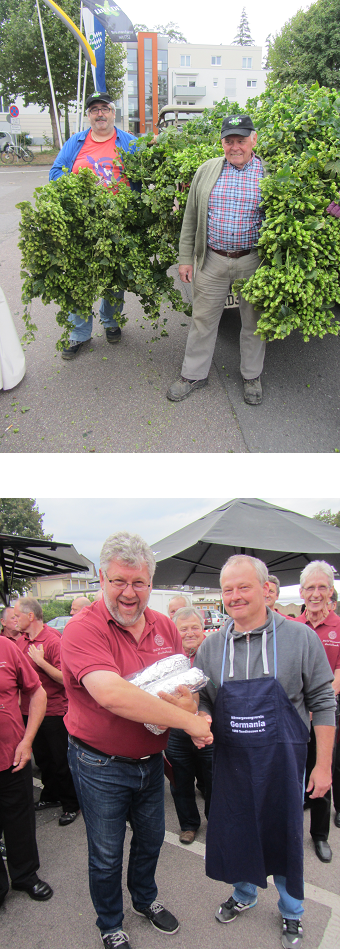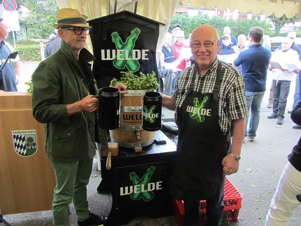 Nachdem am Samstag schon am Vormittag fleißig gezopft wurde, erfolgte die offizielle Eröffnung um 12:00 Uhr durch Gemeinderat Frieder Flory. Er hieß die Gäste willkommen und dankte den Hopfenpflegern unseres Vereins für ihre geleistete Arbeit. Er betonte, dass in diesem Jahr neben den üblichen Arbeiten auch noch jede Menge „Gießwasser“ notwendig war, um heute diese Ernte einzubringen. Im Anschluss sprach auch der Chef der Weldebrauerei Herr Dr. Hans Spielmann Begrüßungsworte, um danach den Hahn mit zwei gekonnten Schlägen ins neue „Freibierfass“ zu treiben. Mit einigen Liedern unter der Leitung unseres Vizedirigenten Timo Machmeier umrahmten wir die Eröffnung. Das Freibier fand schnell seine Abnehmer.
