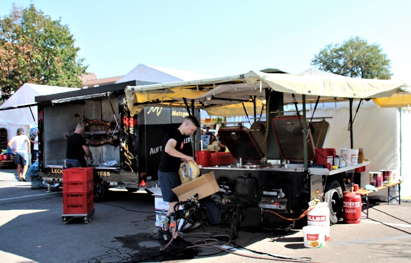 Am Wochenende 31. August / 01. September war es wieder soweit: Unser Hopfenfest und das traditionelle „Hopfäzopfä“ fanden statt. Doch in diesem Jahr gab es eine Neuerung: Nachdem Motto „Alles unter einem Dach“ haben wir in Absprache mit der Gemeindeverwaltung ein großes Zelt aufgebaut, um die Feiernden und die Hopfenpflücker *innen sowie den Thekenbereich unter einem Dach zu vereinen. In Zusammenarbeit mit dem Bauhof war auf dem Festplatz alles vorbereitet. Die Logistik für die Bewirtung der Gäste war aufgebaut und gutes Wetter war bestellt. In diesem Jahr gab es auf der Speisekarte eine Erweiterung des Angebotes. Nachdem letztjährig am Samstag das kulinarische Highlight „Ochs am Spieß“ erfolgreich Premiere feierte, waren es in diesem Jahr die leckeren Rumpsteaks, die am Sonntag ihre Abnehmer fanden. Dafür konnten wir wieder die Ochsenbraterei der Metzgerei Fessler aus Odenheim gewinnen. Das eingespielte Team um den Metzgermeister und Fleischsommelier Markus Fessler ließ im wahrsten Wortsinn nichts anbrennen und sorgte so für den kulinarischen Genuss. Der imposante Ochse, welcher sich am Eingang des Zeltes in einem speziellen Grillwagen in voller Pracht drehte, ließ einem schon beim Ansehen das Wasser im Munde zusammenlaufen. Aber auch alle „Hausmacherfreunde“ kamen auf ihre Kosten, denn auch wir haben einen Metzger namens Markus in unseren Reihen. Er sorgte mit seinem Team wieder für die „Original Sandhäisa Hausmacher“ als Belag für unsere beliebten „Woaschdäweck“.