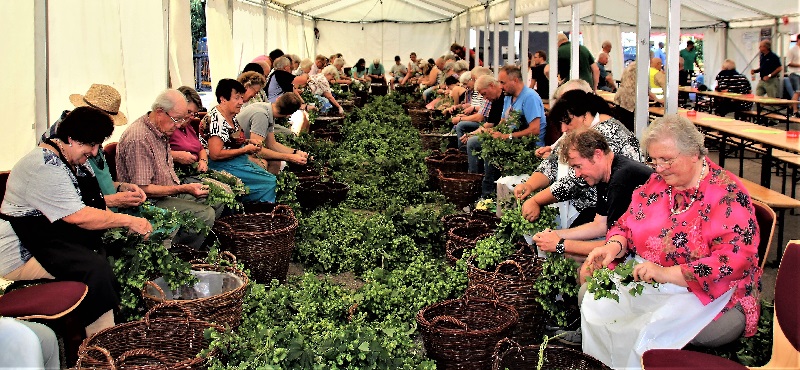 Danach ging die Hopfenernte weiter. Die Sonne lachte wieder vom Himmel und die Temperaturen waren ein paar Grad auf angenehme Werte zurückgegangen. So war der Zuspruch wieder sehr rege. Den Helferinnen und Helfern hinter der Theke und am Grill wurde es nicht langweilig, denn schließlich wollen hungrige Mägen und durstige Kehlen nicht warten. Die angebotenen Rumpsteaks waren heiß begehrt.
