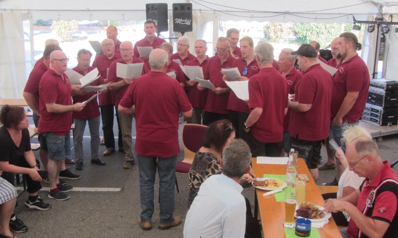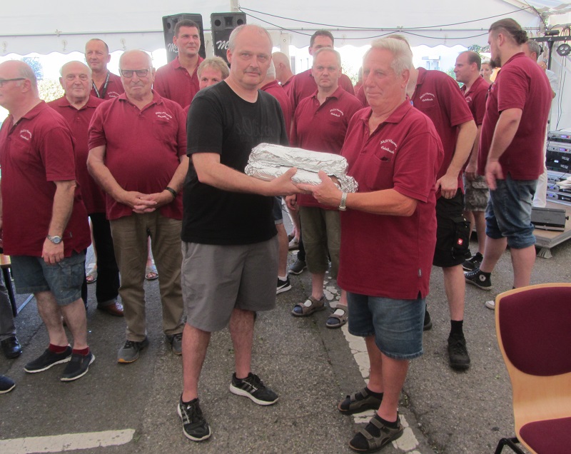 Am Samstag ist es zwischenzeitlich schon eine Tradition, dass uns unsere Freunde des MGV „Harmonie“ aus Eschelbach mit ihrem Dirigenten Helmut Epp einen Besuch abstatten. Nach einer Stärkung und der Befeuchtung der Kehlen ließen sie ihre Stimmen erschallen trugen mit ihren Liedvorträgen zur Unterhaltung unsrer Gäste bei. Als Dank erhielten sie „Original Sandheisa Hausmacher“ aus den Händen unseres Vorstandes Markus Kolb.