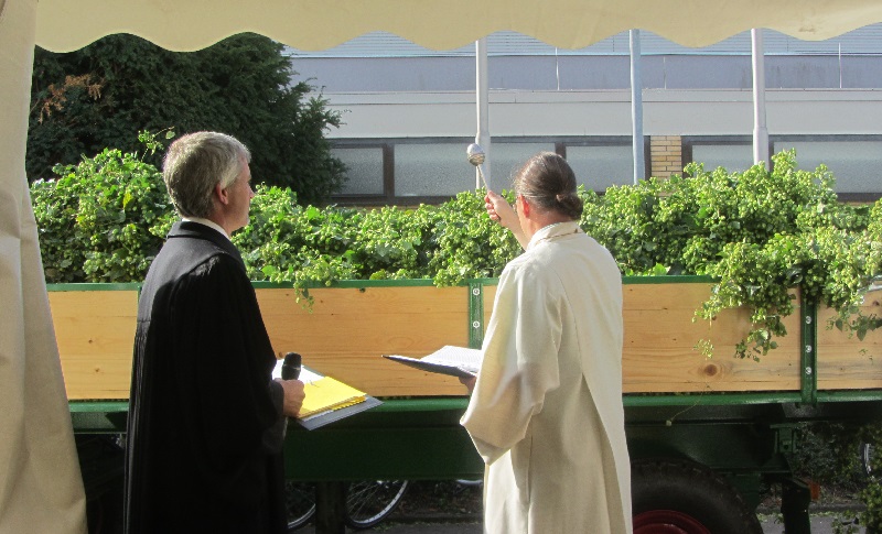 Am Sonntag hieß es für alle Sänger wieder Einsatz zeigen. Denn der zweite Festtag begann wie im Vorjahr mit einem ökumenischen Gottesdienst. Nachdem das Zelt für die kirchliche Feier vorbereitet war, bat uns unser Dirigent zum Einsingen. Um 09:30 Uhr begann die kirchliche Feier unter der Leitung von Pfarrer Bernhard Wielandt und Pastoralreferent Gernot Hödl. Im Rahmen dieses Gottesdienstes trugen wir unter der Leitung unseres Dirigenten FDB Walter Muth die Lieder „Handwerkers Abendgebet“ mit dem Solist Markus Kolb und „Lord, I want to Be a Christian“ vor. Zum Abschluss segneten PR Hödl und Pfr. Wieland die Hopfen.