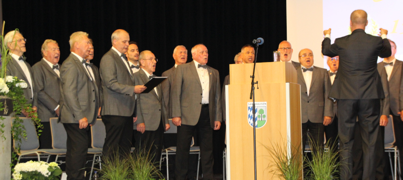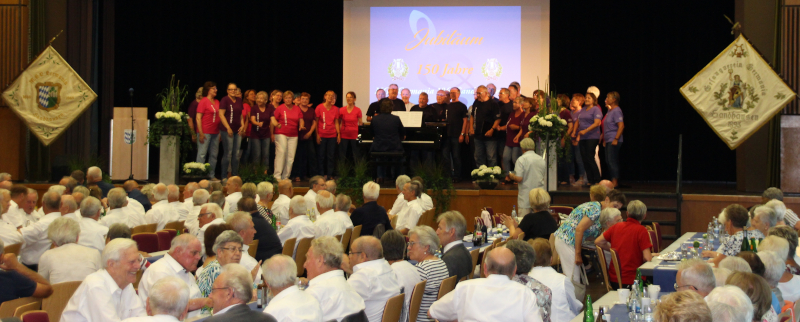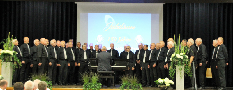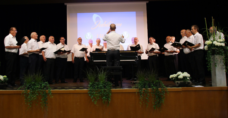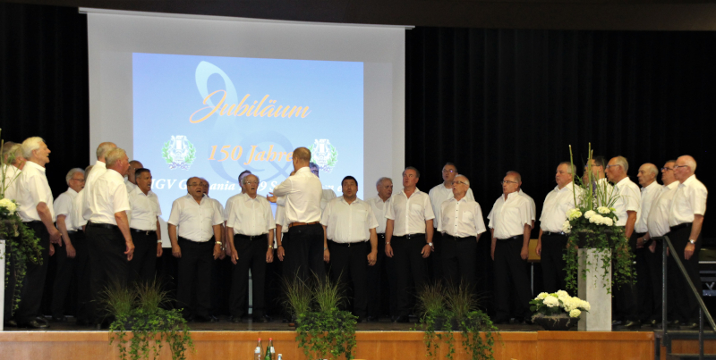 Am Samstag, den 06. Juli war es endlich soweit: Wir eröffneten um 15:00 Uhr mit dem Lied „Schwinge dich auf mein Lied, schwinge dich auf“ das Freundschaftssingen am ersten Tag unseres 150- jährigen Jubiläumswochenendes. Nach der Begrüßung unserer Gäste und der teilnehmenden Vereine folgte noch unser Liedvortrag „Only You“, bevor wir die Bühne freigaben für die am Freundschaftssingen gemeldeten Vereine. Ihre Visitenkarte gaben bei uns ab: Der „MGV Harmonie Eschelbach 1906“ unter der Leitung von Helmut Epp, der „GV Deutsche Einheit 1906 Rheinhausen“ unter dem Dirigat von Walter Muth, der „MGV Konkordia 1907 Dielheim“ mit Dirigent Eugen Mack, der „Sängerbund Liederkranz Oftersheim“ unter Leitung von Fritz Kappenstein und die „Sängereinheit 1867 Edingen“ mit Chorleiterin Peny Bauer. Ferner der „MGV Frohsinn 1901 Rotenberg“ und der „GV Neckarhausen 1859/1897“, beide mit Walter Muth als musikalischem Leiter. Besonders freuten wir uns über die Teilnahme der „Chorsängervereinigung 1791 Geinsheim“ - dem ältesten Gesangverein in Deutschland - mit ihrem Chorleiter Peter Meinhardt.