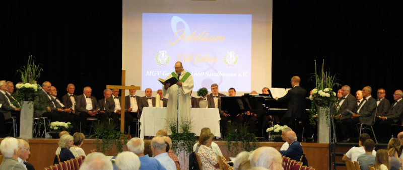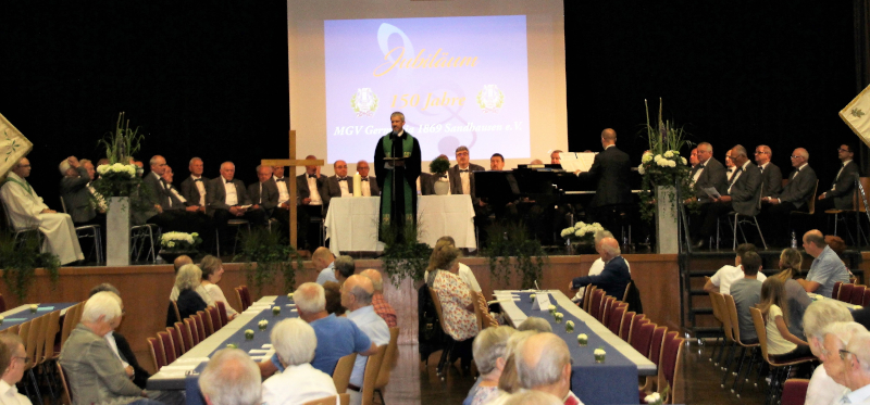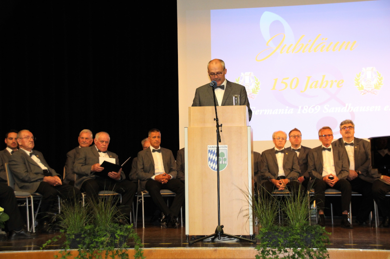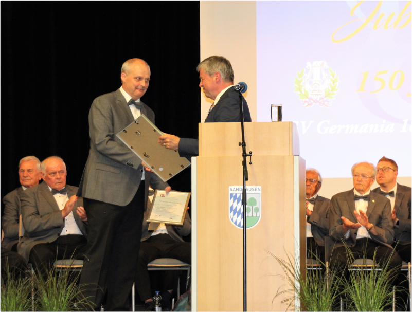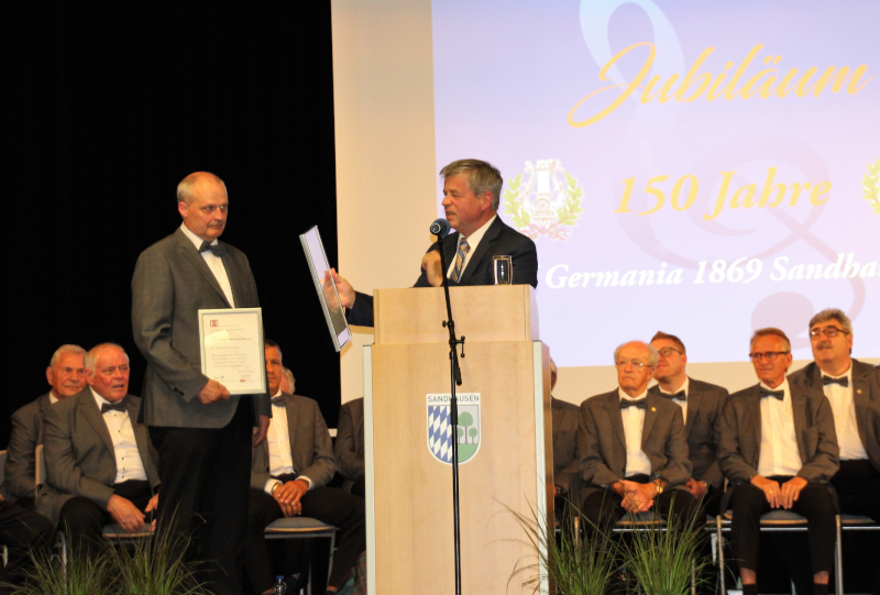 Im Anschluss folgte der offizielle Teil unseres 150- jährigen Jubiläums. Nach unserem Eröffnungslied begrüßte unser Vorstand Markus Kolb die Gäste. Im Anschluss daran war es unserem Schirmherrn Bürgermeister Georg Kletti vorbehalten, Grußworte an uns zu richten. Er beglückwünschte uns zu 150 Jahren Chorgesang und erinnerte auch an die Gründungsväter, die in einer sicherlich nicht einfachen Zeit den Mut zur Gründung eines Vereins hatten. Es zeigt sich aber, dass Musik und Gesang auch in schweren Zeiten für einen Zusammenhalt der Menschen sorgen kann. Er hatte aber auch kritische Anmerkungen parat. Gerade in der heutigen Zeit mit einem übergroßen Angebot an medialen Diensten haben es Vereine - und nicht nur Gesangvereine - zunehmend schwerer, Nachwuchs zu finden. Er dankte dem Verein für sein kulturelles Wirken im Ort und überreichte zum Schluss seiner Rede, im Namen der Gemeinde, an den Vorstand ein Geschenk. Nach einem weiteren Liedvortrag überbrachte der Vorsitzende des „Chorverbandes Kurpfalz Heidelberg“ Herr Ullrich Engelhardt die Glückwünsche des hiesigen und des „Badischen Chorverbandes“. Mit den Übergaben der Urkunden, einer Spende sowie der Ehrengabe einer Notenspende folgten die Ehrungen verdienter Sänger durch den Verband. Dies übernahm Herr Reinhardt Zigahl. Er überreichte den Geehrten Markus Kolb und Thomes Schneider für 40 Jahre, Walter Schneider für 50 Jahre und Rolf Heerlein für stolze 65 Jahre aktive Sängertätigkeit jeweils eine Urkunde und die Sängernadel. Mit dem Lied „Handwerkers Abendgebet“ (Solist Markus Kolb) würdigte der Chor die Geehrten. Im Anschluss sprach Rainer Hilbert im Namen der „Sandhäuser Chorgemeinschaft“ („AGV Sängerbund“, „GV Liederkranz“ und „MGV Cäcilia“) Grußworte und überreichte eine Spende.