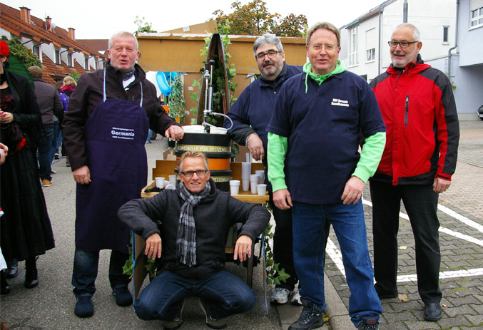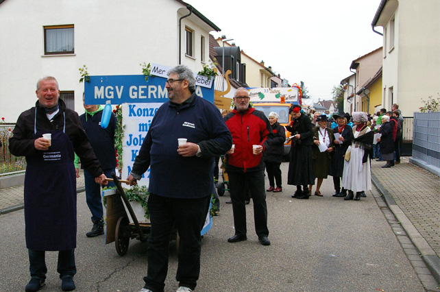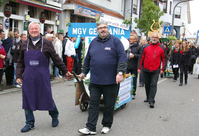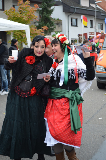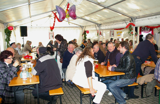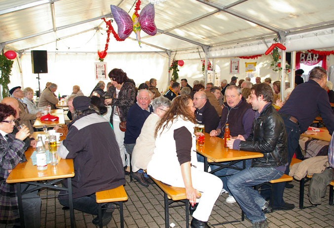 Jedenfalls war alles sehr lustig, nicht nur wegen unseres Sektes, sondern auch, weil die Franzosen direkt hinter uns fuhren. Und die haben ja bekanntlich sehr guten Wein! Jedenfalls hatten wir in Sachen Völkerverständigung absolut keine Probleme. Wenn alle Kerwe-Besucher so viel Spaß hatten wie wir, alleine während des Umzugs, war das wieder eine gelungene Sache. Unser neues, helles und freundliches Zelt hat sehr gefallen.