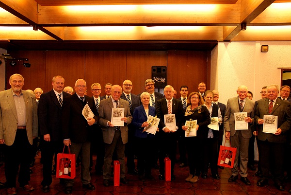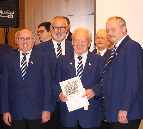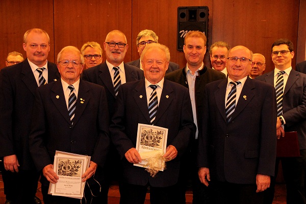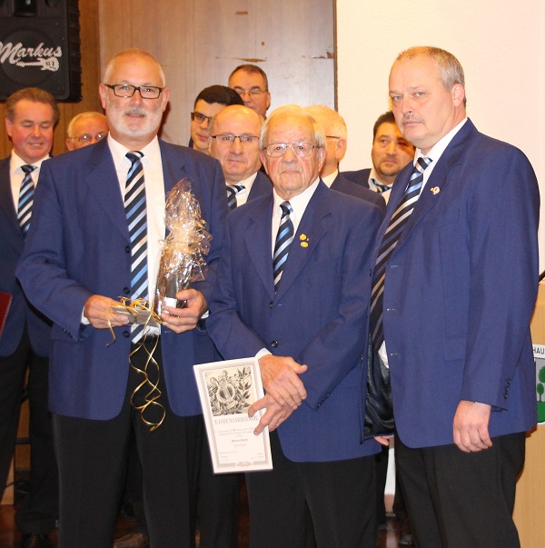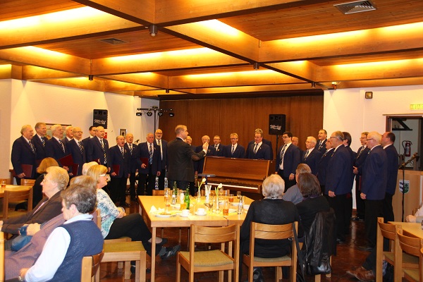 Am Samstag, dem 14. Januar fand im Festhallenrestaurant unsere erste Veranstaltung in diesem Jahr statt. Zu unserem Liederabend, an welchem auch die Ehrungen verdienter Sänger und passiver Mitglieder für langjährige Treue zum Verein stattfanden, waren alle herzlich eingeladen. Nach dem Eröffnungslied begrüßte unser Vorstand Markus Kolb die Anwesenden. Sein besonderer Gruß galt den Ehrenmitgliedern und Herrn Reinhard Zigahl vom Badischen Chorverband. Ebenso herzlich begrüßte er unseren Chorleiter Musikdirektor FDB Walter Muth und seine Gattin. Für die Presse war Herr Werner Popanda anwesend und für gute Stimmung sorgte wieder unser Musiker „Markus-Musik“. Beiden galt sein Willkommensgruß. Nach einem weiteren Liedvortrag folgte die Sängerehrung durch den Badischen Chorverband. Herr Zigahl konnte unseren Aktiven Werner Breiter für 65 Jahre Vereinszugehörigkeit mit einer Urkunde und der Sängernadel ehren. Der Verein schloss sich an und überreichte Werner neben der Urkunde ein Präsent. Eine weitere Vereinsehrung erhielt unser Aktiver Gerhard Volk für 25 Jahre Vereinstreue. Nach einem weiteren Lied folgten die Ehrungen unserer passiven Mitgliedern. Es war bedauerlich, dass eine große Zahl der zu Ehrenden unserer Einladung nicht gefolgt sind. Nach dem obligatorischen Gruppenfoto ließ der Chor nochmals seine Stimmen erklingen. Im Anschluss des Ehrungsteils war es wieder unser Musiker, der die Gäste unterhielt.