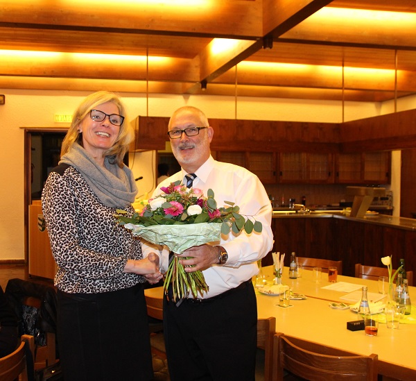 Zum Abschluss des offiziellen Teils waren nochmals Dankesworte angesagt. Unser Chorleiter Walter Muth erhielt neben dem Dank für den guten Beginn der Zusammenarbeit ein flüssiges Präsent und seine Gattin Margit einen Blumenstrauß. Ein weiterer Dank ging an Karin Kolb für ihr Engagement beim Erstellen des Germania-Echos. Auch sie wurde mit einem Präsent bedacht.