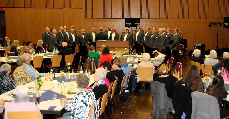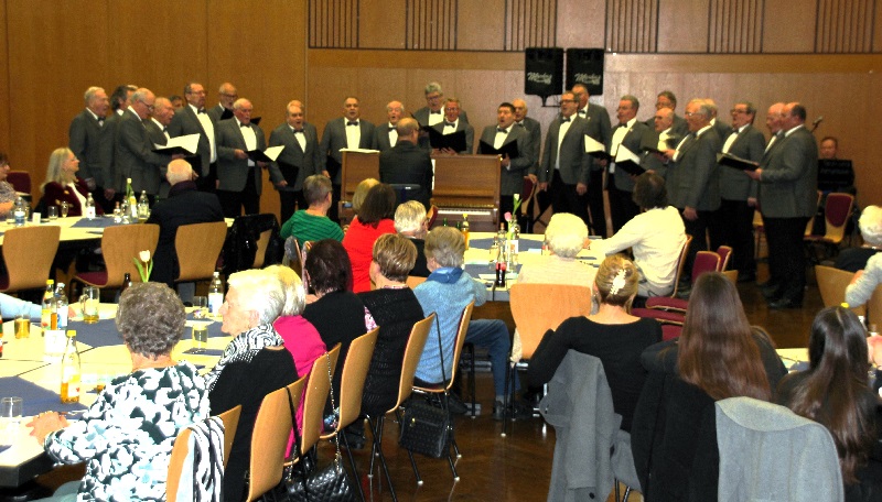 Am Samstag, den 27.Januar veranstalteten wir wieder unseren Liederabend in der Festhalle mit den Ehrungen unserer verdienten Sänger und passiven Mitgliedern. Pünktlich um 17:00 Uhr eröffnete der Chor trotzt einiger krankheitsbedingter Ausfälle stimmgewaltig unter dem Dirigat unseres Chorleiters Walter Muth mit dem Lied „Schwinge dich auf, mein Lied“ den Abend. Danach begrüßte unser Vorstand Markus Kolb alle Anwesenden. Ein besonderer Gruß galt unseren Ehrenmitgliedern und unserem Ehrenvorstand Manfred Zimmermann mit Gattin. Er informierte über den Ablauf des Abends, bei dem es weniger um Reden als um Geselligkeit und guter Unterhaltung gehen sollte. Für diese Unterhaltung hatten wir wieder mit unserem bewährten Musiker „Markus-Musik“ einen Garanten für gute Stimmung engagiert. Auch ihm galt ein herzliches Willkommen. Mit unserem zweiten Chorvortrag „Es klingt ein Lied“ leiteten wir zu den Ehrungen verdienter Sänger über. Da der Chorverband keinen Vertreter für die Ehrungen vor Ort mehr entsendet, sondern eine zentrale Ehrungsmatinee durchführt, haben wir diese Ehrung in Eigenregie durchgeführt. Der zweite Vorstand Wolfgang Roedel übernahm diese Aufgabe und erklärte zu Beginn, dass wir diese Ehrungen im eigenen Verein durchführen möchten, dort also, wo auch die Jubilare sich ihre Verdienste ersungen haben. Es standen zwei Ehrungen verdienter Sänger an: Hermann Schneider für 60 Jahre und Rolf Heerlein für 70 Jahre Singen im Chor.