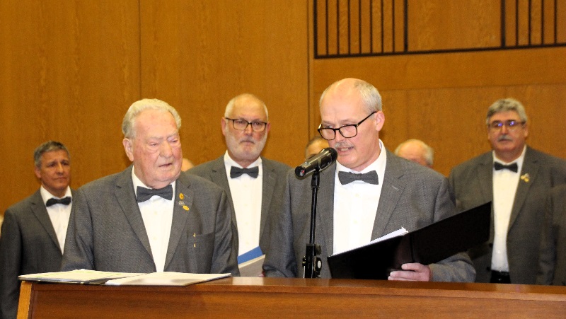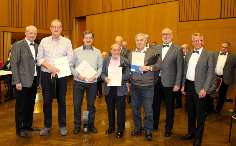 Dann bat Wolfgang unseren Sänger Rolf nach vorne. Er betonte, dass eine Auszeichnung in dieser Form auch beim Verband immer etwas Besonderes ist und überreichte die Urkunde für sagenhafte 70 Jahre Singen im Chor und die Ehrennadel des Deutschen Chorverbandes.