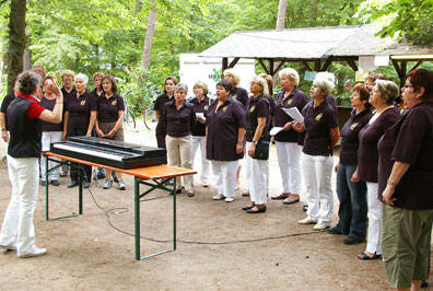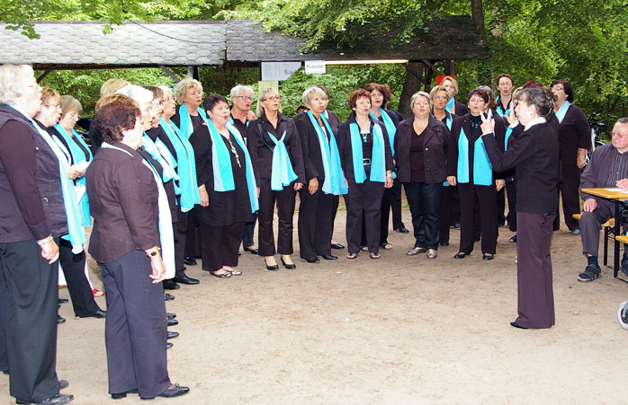 Somit denken wir: Es hat allen gut geschmeckt. An dieser Stelle ein ganz herzliches DANKESCHÖN an alle Helferinnen und Helfer. Ein Sängerfest ohne Gesang geht nicht, also trat unser Frauenchor BELCANTO am Nachmittag unter Leitung ihrer Dirigentin, Frau Anetta Stanewa-Gilbert auf. Sie (also wir, denn ich gehöre ja auch dazu), also wir sangen mit viel Freude unsere Lieder „Sing‘ mit uns unser Lied“, „Eleni“, Let’s talk about Jesus“, „Heaven“ und „Wo meine Sonne scheint“. Es hat uns wie immer sehr viel Spaß gemacht. Ich glaube schon, daß es unseren Gästen Freude gemacht hat, uns zuzuhören.