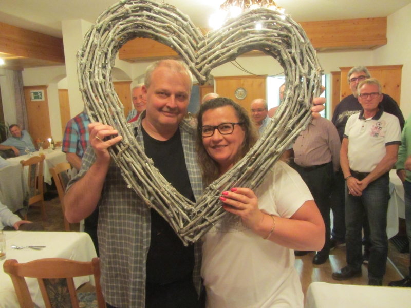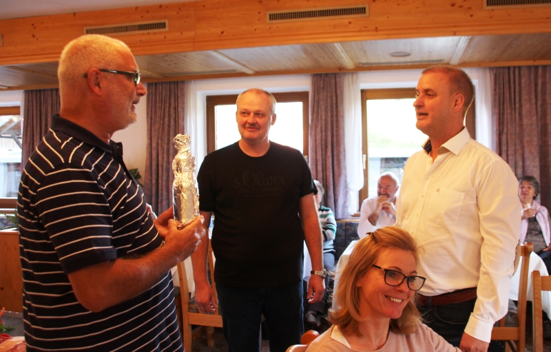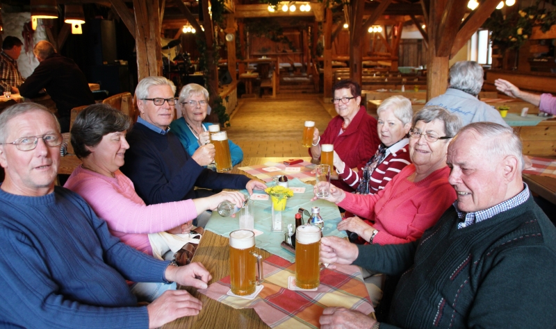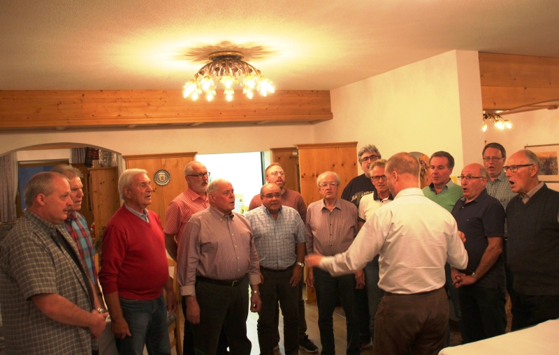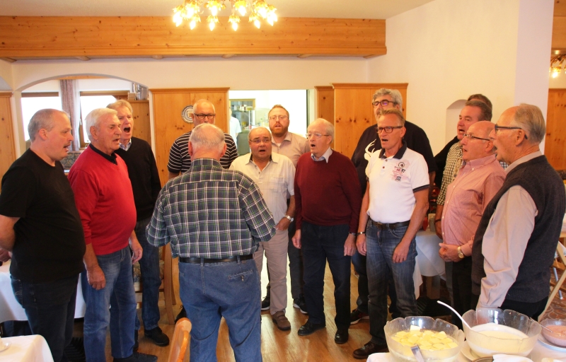 War uns das Wetter gestern wohlgesonnen, hatte der Wettergott für den heutigen Tag zunächst Regen vorgesehen. Doch zuerst wurde wieder ausgiebig gefrühstückt. Danach ging die Fahrt nach Berwang. Bei Reutte ging es auf der B 197 bis Bichlbach und dann ins Namlostal hinauf auf 1336 m nach Berwang. Hinter Reutte bei der Ruine Ehrenberg überquert die bei der Einweihung längste Fußgänger-Hängebrücke Europas das Tal. In Berwang befindet sich die höchstgelegene Hausbrauerei Österreichs „Stadl-Bräu“ im Hotel „Thaneller“. Bei einer Führung erfuhren wir vom Chef „Gustl“ und seinem bayrischen Braumeister Walter (von allen nur „Braui“ genannt) Wissenswertes über die Bierherstellung. „Gustl“ war überrascht als er erfuhr, dass auch bei uns Hopfen wächst. Hopfenbauer Albert interessierte die verwendete Hopfensorte, da nach Gustls Aussage er Hopfen in Pelletform aus der Hallertau verwendet. Nach so vielen Informationen starteten wir immer noch bei Regen zu einer Fahrt mit dem „Stadl-Bräu-Express“ zu einem Wasserfall – ganz zum Wetter passend. Lokführer „Michael“ drehte noch einige Runden und brachte uns sicher wieder zum Ausgangspunkt zurück. Nach diesem Abstecher nahmen wir im „Stadl-Bräu“ unser Mittagessen ein. Auch hier wurden wieder Lieder angestimmt. Anschließend ging es zurück in Richtung Tannheim. Der Regen ließ nun nach und so fuhren wir zum Vilsalpsee. Da es immer noch leicht nieselte, wurden im Restaurant bei Kaffee und Kuchen zuerst die Laune und dann das Wetter besser. Sogar einige Sonnenstrahlen wurden gesichtet. Die sportlichen Teilnehmer bewältigten den Rückweg zum Hotel per pedes. Andere zogen es vor, unserem Busfahrer Axel bei dessen Rückfahrt Gesellschaft zu leisten. Nach dem Abendessen ließen wir wieder unsere Stimmen erklingen. Jetzt waren Worte des Dankes angesagt. Markus lobte die harmonische Reisegesellschaft. Und weil ohne gute Vorbereitung nichts läuft, dankte er der Person ganz besonders, die dafür verantwortlich war: Seiner Frau. Als Geschenk erhielt sie ein großes Herz. Danach sorgte ein Alleinunterhalter für Stimmung. Wenn jemand in Holland geboren wurde, im Rheinland aufwuchs und seit über 40 Jahren in Bayern lebt, kann man wohl von einem internationalen Künstler sprechen. Dies erzählte mir Horst, so hieß unser Musiker, der früher mit einer Band professionell Musik machte. Er verstand es super, mit seiner Musikauswahl unseren Geschmack zu treffen. Die Tanzfläche war meistens gut besucht und auch Liedwünsche erfüllte er. Gegen Mitternacht klang sein Engagement aus und bei seinen Abschiedsworten lobte er unseren Chorklang, dem er an diesem Abend lauschte. Dies freute uns natürlich, denn schließlich ist er vom Fach. Den Abschluss bildete passend dann noch das Lied „`s ist Feieroamd“ mit Solist Markus.