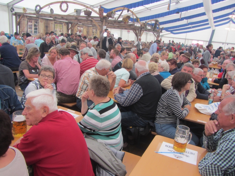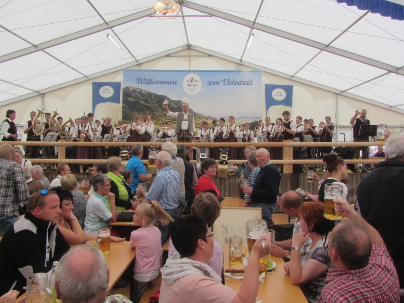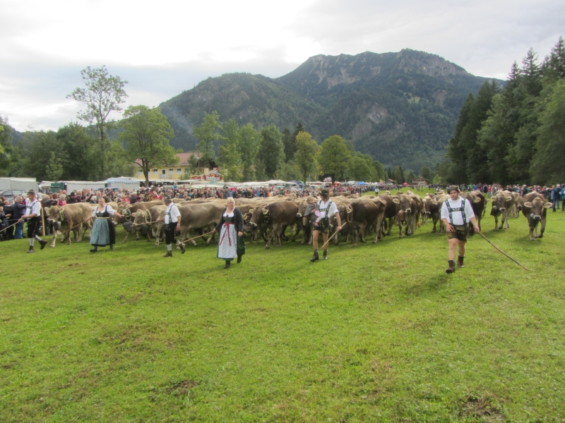 Am zweiten Tag stand die Fahrt nach Bad Hindelang zum Besuch des Viehscheids auf dem Programm. Da die Abfahrt um 08:30 Uhr erfolgen sollte, waren alle zeitig zum Frühstücksbuffet erschienen. So setzte sich der Bus fast pünktlich in Bewegung. Zunächst über das Oberjoch ging es dann in vielen Serpentinen, die unser Fahrer Axel gekonnt meisterte, hinunter nach Bad Hindelang. Vom Busparkplatz war es nicht mehr weit zum Festgelände. Aus dem großen Festzelt war schon zünftige Blasmusik zu hören und auch die Schellen von den bereits eingetroffenen Tieren waren zu vernehmen. Dicht an dicht standen die Besucher rings um den Scheidplatz und erwarteten die nächste Herde. Die Organisation sah vor, dass die Tiere im Stundenabstand von den einzelnen Alpen im Tal eintreffen. Angeführt vom prächtig geschmückten Leittier (Kranzrind) begleiteten nicht minder stolz die Sennerinnen und Senner die Herde. Am Ende des Platzes wurden die Tiere „geschieden“, d. h. ihren jeweiligen Besitzern zurückgegeben. Bis zum vereinbarten Treffpunkt am Festzelt (hier waren für 12:30 Uhr Plätze reserviert) gab es noch ausgiebig die Möglichkeit, den großen Krämermarkt zu besuchen. Im Festzelt war eine gute Stimmung und die „Hindelanger Musi“ sorgte für tolle Blasmusik. Wie überall durften auch hier die Prominenten (Großkopfädä) ein Musikstück dirigieren. So der Chef des Bierlieferanten und der Festwirt. Bis zur Rückfahrt bestand auch noch die Möglichkeit, den Ort zu erkunden und ein Reiseandenken zu erstehen. Die Heimfahrt zum Hotel verlief ohne Probleme und beim Abendessen trafen sich alle wieder im Speisesaal. Nach dem Essen war für manche ein kleiner Verdauungssparziergang angesagt. Andere schonten ihre Sohlen und bewerkstelligten das Gleiche mit einem flüssigen „Verdauerlä“. So klang der zweite Tag harmonisch aus.