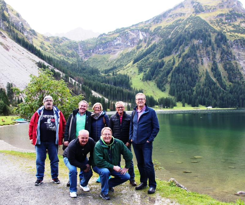 Erwartungsfroh trafen die Reiseteilnehmer am Sonntagmorgen auf dem Festplatz ein. Nachdem das Gepäck im Bus verstaut war und alle ihre Plätze eingenommen hatten, starteten wir beinahe pünktlich in Richtung Allgäu. Nach einer kurzen Begrüßung durch unseren Vorstand Markus ergriff unser Busfahrer Axel das Wort und gab uns einige erste Informationen bezüglich der geplanten Wegstrecke. Diese führte uns zunächst über die A 5 und A 8 bis nach Ulm. Da am Sonntag keine LKW auf der Autobahn unterwegs waren, kamen wir recht zügig voran. Nur im Baustellenbereich der A 8 ging es etwas langsamer voran. Hier wird der dreispurige Ausbau bewerkstelligt und es war beeindruckend, was hierzu an Erdbewegung notwendig war und noch ist. Parallel wird auch noch die neue Bahnstrecke gebaut und bei dem Albaufstieg waren schon die für die Brücke notwendigen Stützen im Rohbau zu erkennen. So kamen wir zur geplanten Zeit in Ulm an und der Fahrer fuhr im Zentrum auf den Busparkplatz. Von hieraus schlenderten wir am Münster vorbei durch die Fußgängerzone zum „Cafe im Kornhauskeller“. Hier nahmen wir unser Frühstück ein. Da wir bereits von unterwegs unsere Frühstückswünsche telefonisch durchgegeben hatten, saßen innerhalb kürzester Zeit alle vor vollen Tellern und Tassen. Nach der ausgiebigen Stärkung ging`s wieder zurück zum Bus, aber nicht ohne vorher das Ulmer Münster zu besichtigen. Das im gotischen Baustil errichtete Gotteshaus ist die größte evangelische Kirche Deutschlands. Der 1890 vollendete 161,53 m hohe Turm ist der höchste Kirchturm der Welt. Nach dieser beeindruckenden Besichtigung ging es über die A 7 weiter unserem Ziel entgegen. Hier kam es zu einem kleineren Stau, welchen wir mit Liedern wegsangen. Gegen 15:00 Uhr trafen wir in Tannheim ein und bezogen im Hotel „Goldenes Kreuz“ für die nächsten Tage unsere Zimmer. Bei der Aushändigung des Zimmerschlüssels wurde uns ein Begrüßungsschnapserl kredenzt. Die Zeit bis zum Abendessen stand zur freien Verfügung. Ab 18:00 Uhr füllte sich der Speisesaal, denn auch eine Busfahrt macht hungrig. Es wurde ein 5- Gänge Menü serviert, wobei beim Hauptgang aus drei Gerichten gewählt werden konnte. Die beiden Kellner Vladimir und Santo ließen bei der Bedienung keine Wünsche offen. Nach dem Essen folgte ein erster Auftritt und für unsere Liedvorträge wurde von den anwesenden Hausgästen nicht an Applaus gespart. Der erste Tag klang dann für viele in der Lobby oder an der Hotelbar aus.