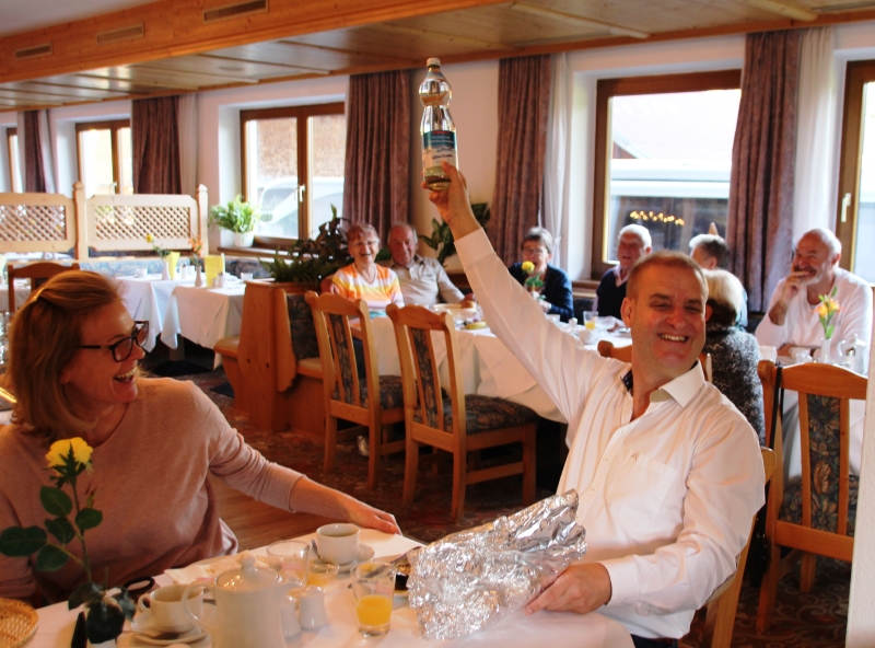 Heute war leider unser letzter Tag und der begann wie immer mit dem Frühstück. Und doch war heute etwas anders. Denn unser Dirigent feierte seinen Geburtstag. Wir nahmen Aufstellung und trugen unter der Leitung von Vize ³ Albert ihm ein Geburtstagsständchen vor. Und Walter`s Liedwunsch „O Herr, welch ein Morgen“ mit Markus als Solist erfüllten wir ihm gerne. Nur auf das Geschenk musste er noch etwas warten, denn dies durfte er sich bei dem folgenden Besuch einer Feinbrennerei aussuchen. So gab es vorab nur eine Flache „ORIGINAL Tannheimer Aqua Hydrante“.