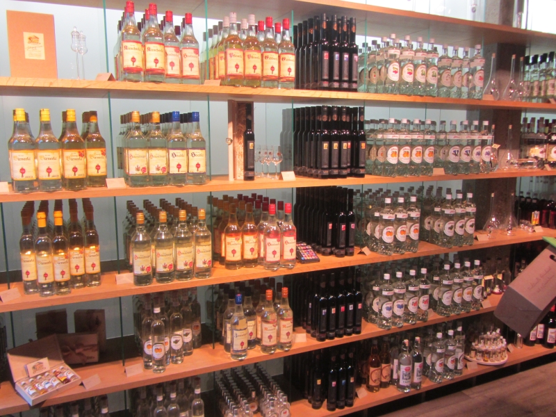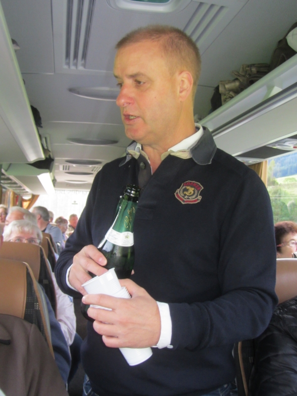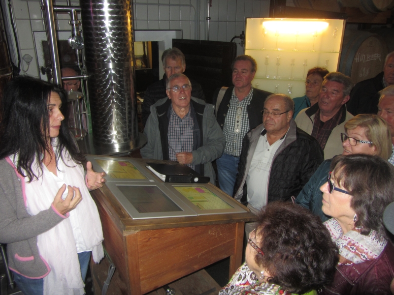 Nachdem alle Koffer gepackt und im Bus verstaut waren, machten wir uns auf die Heimfahrt. Hier hatten wir einen ganz besonderen Bordservice: Unser Geburtstagskind Walter spendierte für alle Sekt und bediente am Platz. Die Fahrt führte uns zunächst Richtung Bodensee. In Hörbranz hatten wir in der Fein-Brennerei „Prinz“ eine Besichtigung gebucht. Von Frau Ulli wurden wir empfangen und erfuhren alles über die Herstellung von feinen Destillaten. Man konnte sich schon vom aromatischen Geruch in den Lagerräumen auf die Verköstigung freuen, denn was so gut riecht, muss auch lecker schmecken. So war es dann auch und manch einer hatte das Problem „Ja welche Sorte nehme ich denn nur mit?“